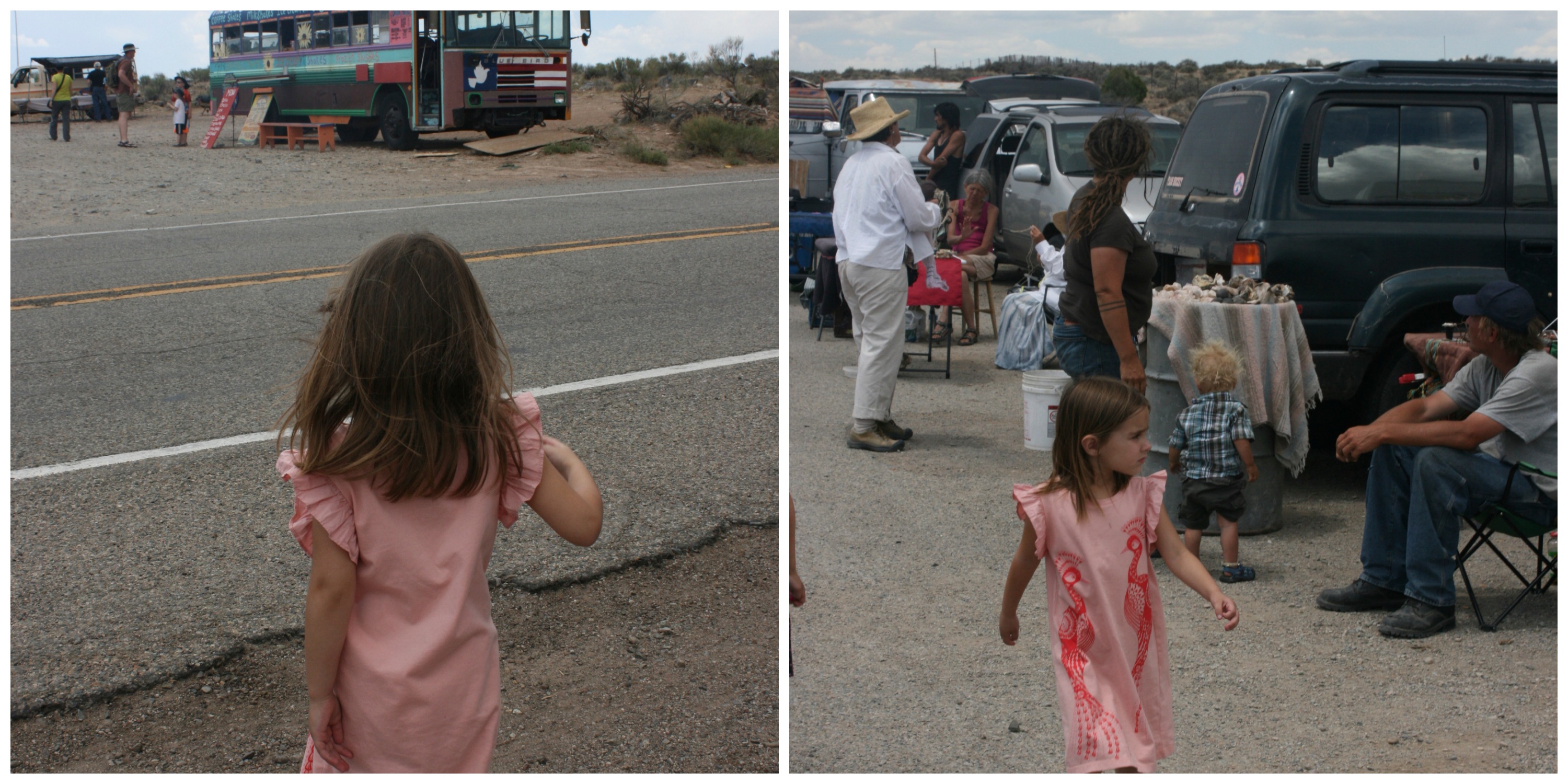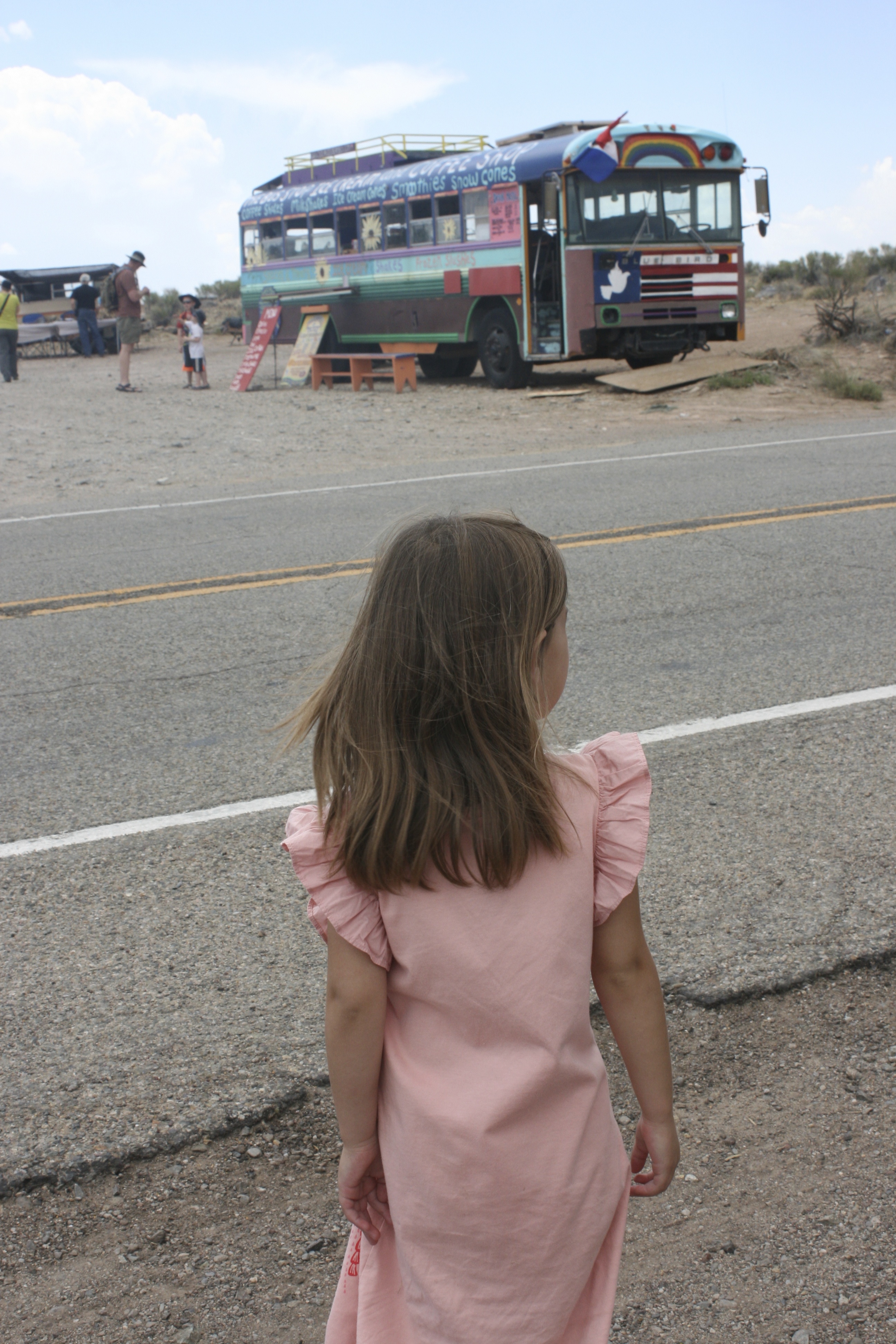 The Rio Grande Gorge bridge is located 11 miles north of Taos New Mexico. Crossing it is not for the faint of heart, but the views are rewarding. Next to the bridge there is ample opportunity for shopping, Native Americans and hippies are selling their jewelry, clothes, and food. A colorful bus (first picture) is selling smoothies.